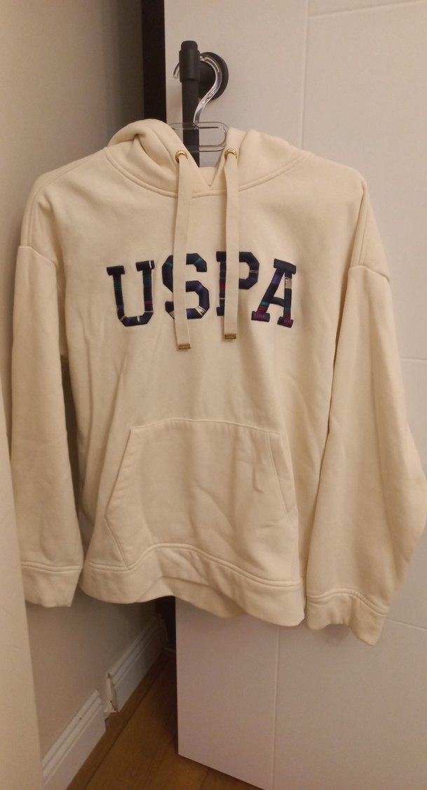 Beyaz, uzun kollu, kapsonlu , rahat kesim eşofman takimi Üzerinde renkli USPA baskısı bulunur. üst boy : 59 cm iki koltuk arasın:56 cm dır alt boy :94 cm bel :40 cm lastikli ve bağlamalı Yumuşak ve sıcak kumaştan üretilmiştir.