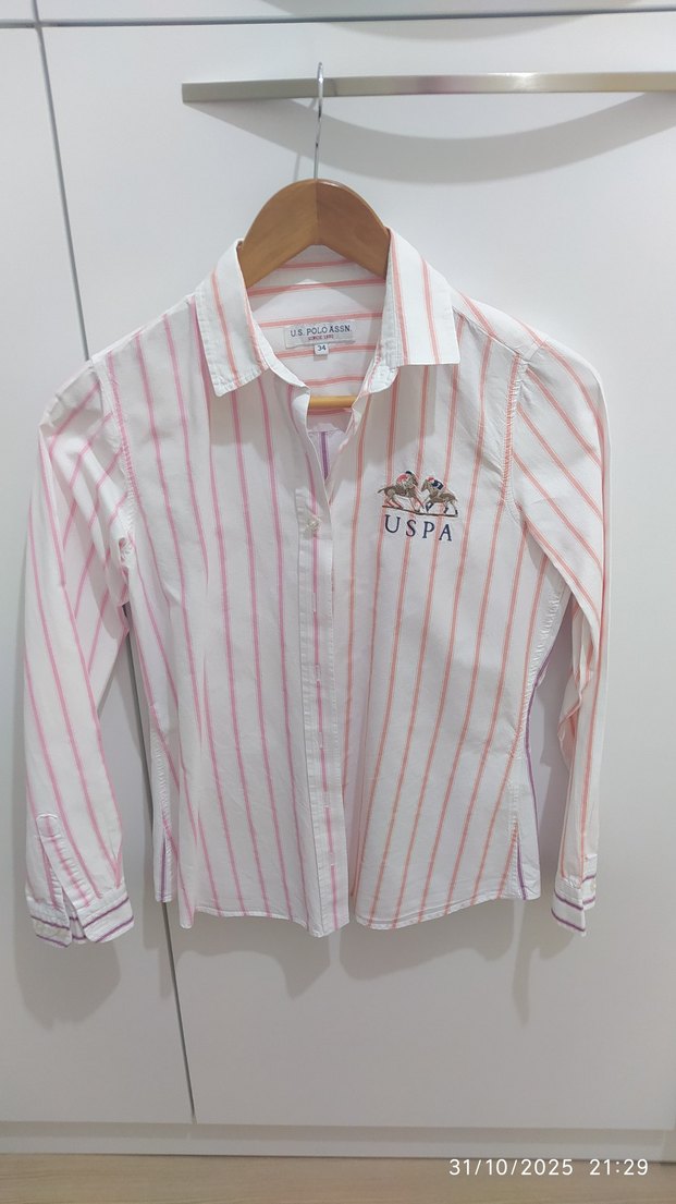 USPA pamuk gömlek, yakalı, düğmeli ve pastel pembe çizgili. Normal kesim, ofis için uygun.