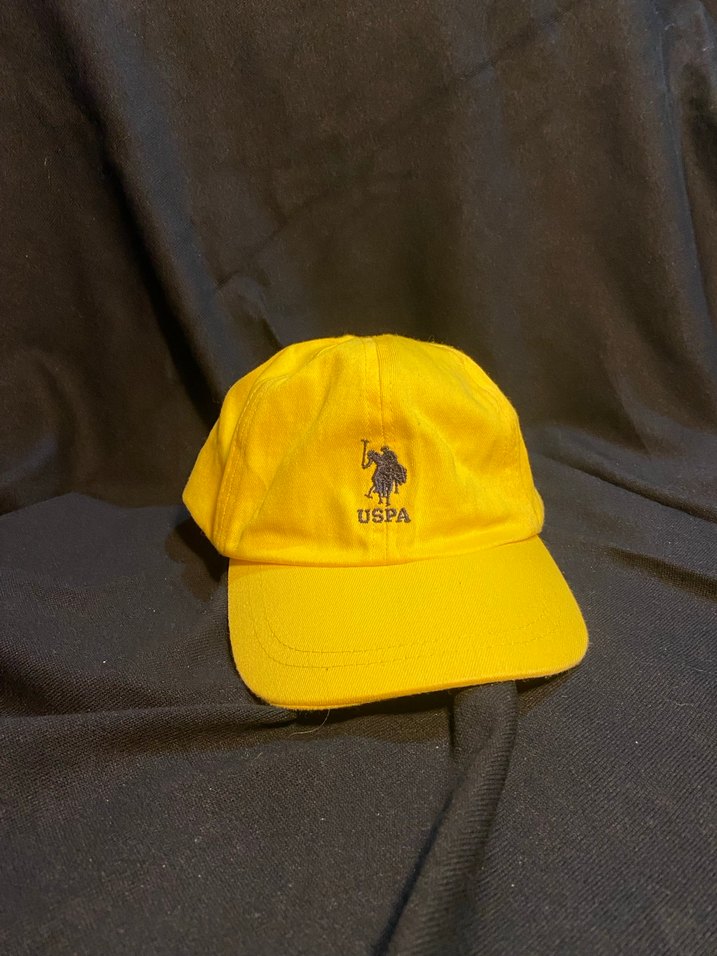 USPA logosu ve parlak sarı renkte, yumuşak ve sıcak kumaştan üretilmiş kadın sokak şapkası.