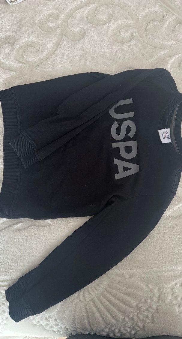 USPA baskılı, uzun kollu, bisiklet yaka siyah sweatshirt. Rahat kesimi ve yumuşak, sıcak kumaşıyla günlük sokak stili için uygundur.