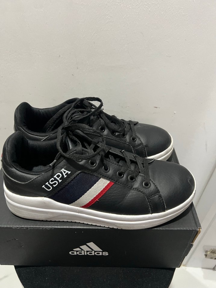 USPA logosu ve çizgili deseniyle siyah spor ayakkabı, stiletto topuk ve cırt cırtlı kapanışa sahiptir. Spor sokak stili için uygundur.