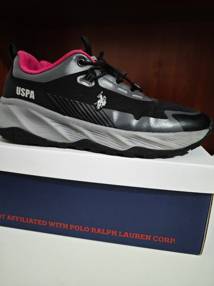 USPA siyah spor stiletto topuklu sneaker, baskılı desen ve cırt cırt detaylı, kauçuk tabanlı, Polo Ralph Lauren Corp ile bağlantılı. sadece taban bölgesinde bir kesik var