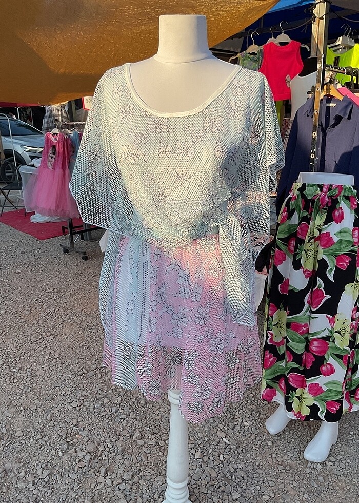 Yan kesim tişört ve etekten oluşur. Organze kumaştan üretilmiştir, kullanılmamıştır.