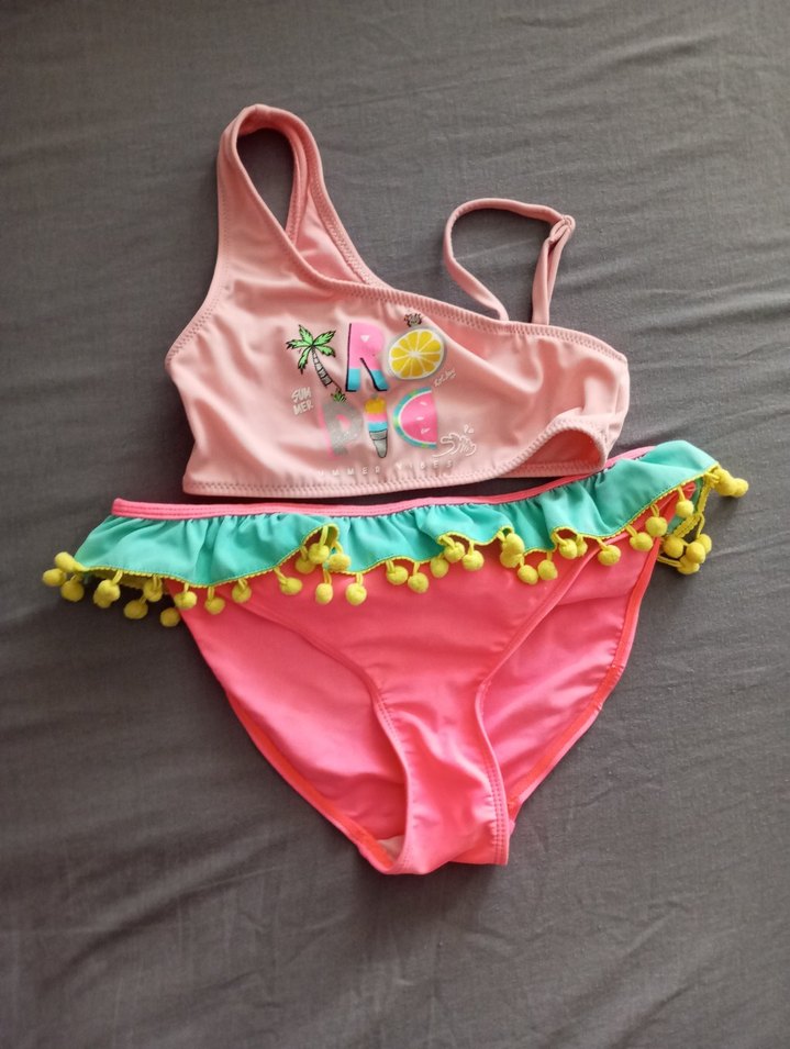 Renkli baskılı üst ve ponponlu fırfırlı alt detaylarıyla kız çocuk bikini takımı, plaj için uygundur. ️