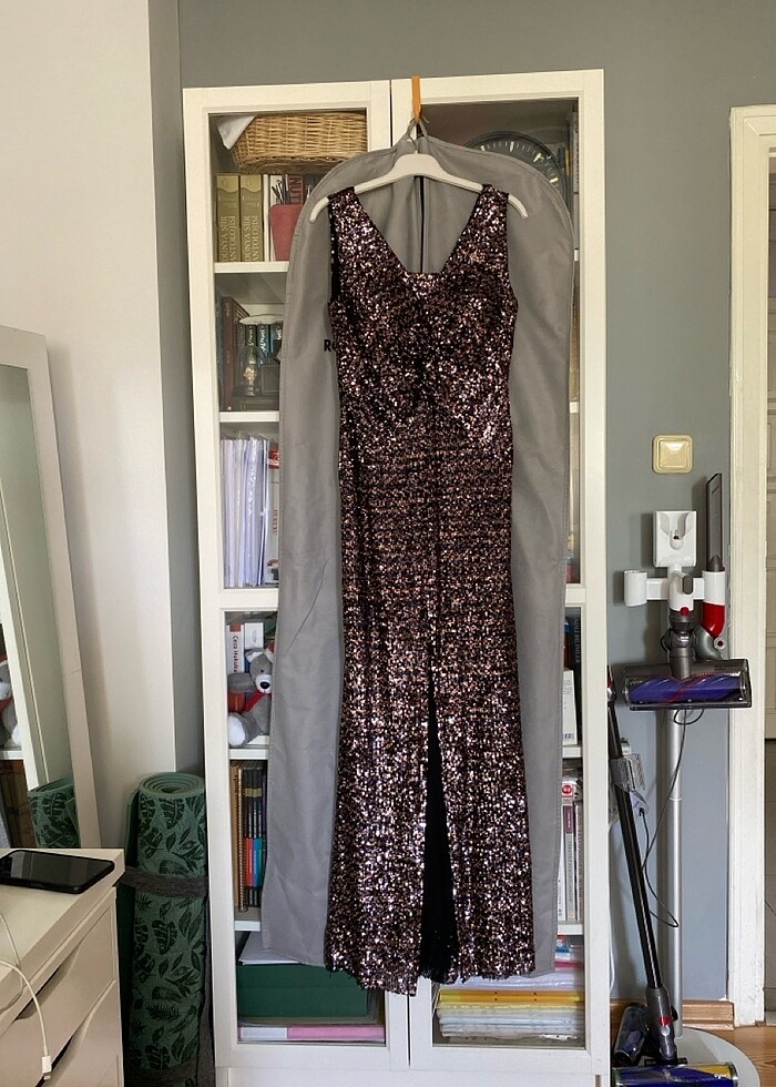 Bakır ve siyah pullu üstü saran önden yırtmaçlı bir kez kızımın düğününde giydim, 42 beden #pırıltılıgece elbisesi