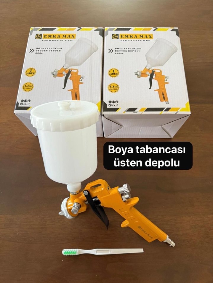 GEMKAMAX boya tabancası, üsten depolu ve turuncu saplıdır. Hassas boyama için uygundur. Temizlik fırçası dahildir.