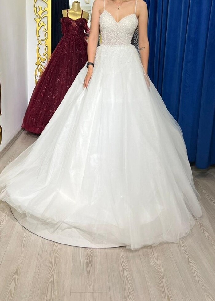 Üstü pırlanta taşlı, çok yoğun değil. eteğe doğru dağılarak bitiyor. etek içi simli, A kesim. duvağın ucunda aynı taşlardan var. kuru temizleme yapılmadı, talep halinde yaptırırım. 46 ve 55 kilolarda giydim ipli olduğu için ayarlanıyor. pazarlık yapabiliriz.