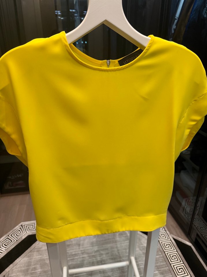 Saten dokulu, parlak sarı renkte, kısa kollu ve yuvarlak yakalı salaş kadın bluz. Günlük ve ya iş yerinde kullanılabilir Hiç giyilmedi - etiketsiz