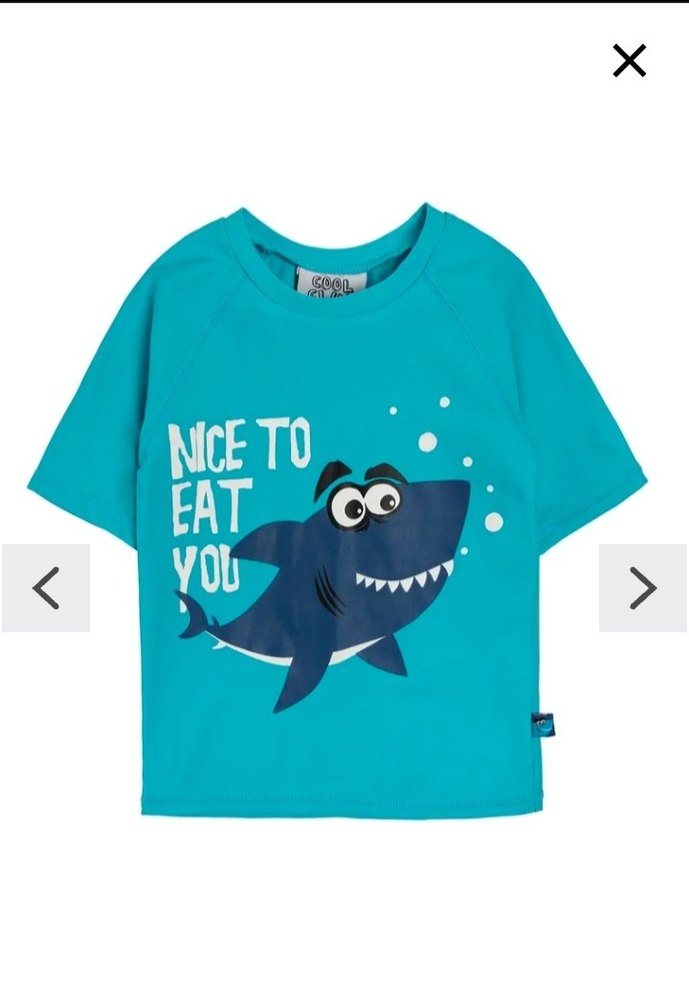Turkuaz renkli, baskılı köpekbalığı deseniyle erkek çocuk mayo tişörtü. Havuz için uygun