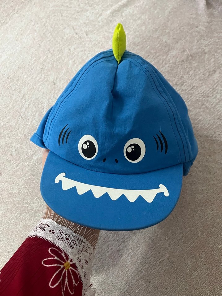 Mavi renkli erkek çocuk şapkası, büyük gözler ve dişlerle işlenmiş dinozor yüzü detayına sahiptir. Üstünde küçük yeşil bir çıkıntı bulunur. Velcro kapamalıdır, yumuşak ve sıcak kumaştandır.