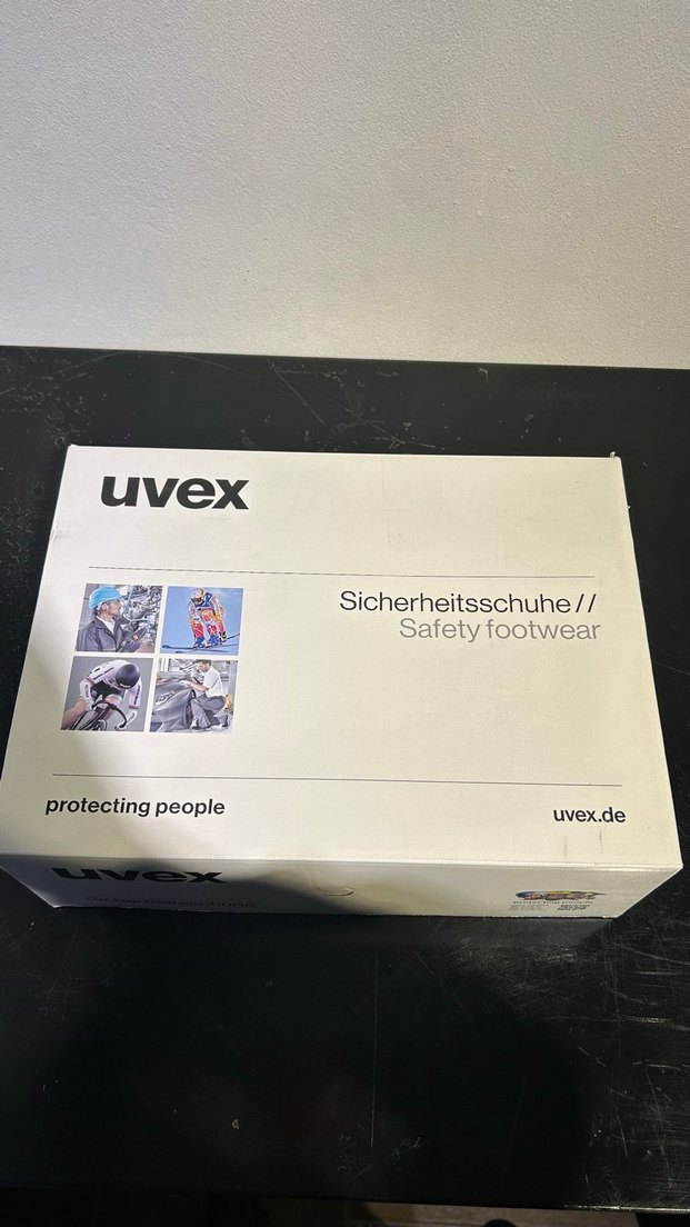 Uvex markasının beyaz ve gri renklerde güvenlik ayakkabısı, koruma amaçlı tasarlanmıştır. Kutuda marka ve güvenlik vurgulanmıştır.