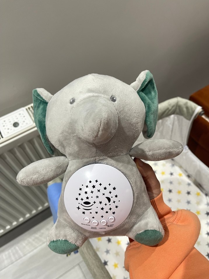 Yumuşak gri fil peluş oyuncak, gövdesinde yıldız ve ay projektörü ile kontrol düğmeleri bulunur. Hiç kullanılmadı tüm tuşları çalışır durumda tertemiz.