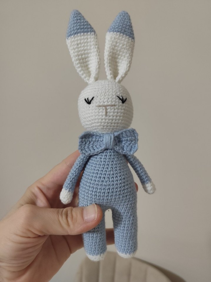 Yumuşak örgü dokusuna sahip, fiyonk detaylı pastel gri el yapımı tavşan peluş oyuncak .