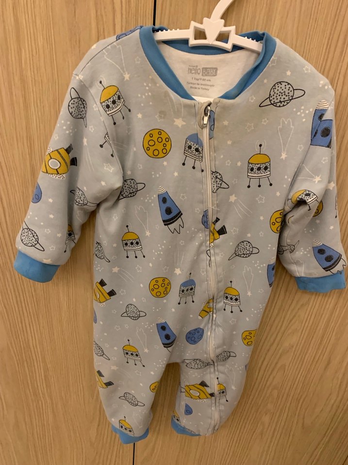 Gri renkli, uzun kollu ve yuvarlak yakalı bebek tulumu. Fermuarlı ve yumuşak, sıcak tutan kumaştan. Uzay temalı desenler içerir.