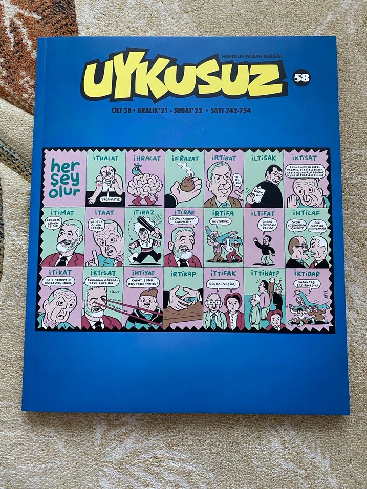 Uykusuz mizah dergisi 58. cilt, Aralık 2021 - Şubat 2022 tarihleri arasındaki 742-754 sayıları içerir. Mizahi çizimler ve karikatürler bulunur.