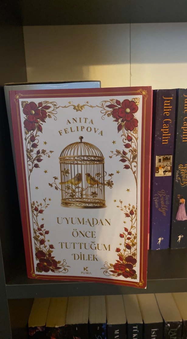 Anita Felipova'nın "Uyumadan Önce Tuttuğum Dilek" adlı romanı, çiçek desenleri ve kafes illüstrasyonuyla dikkat çeker.