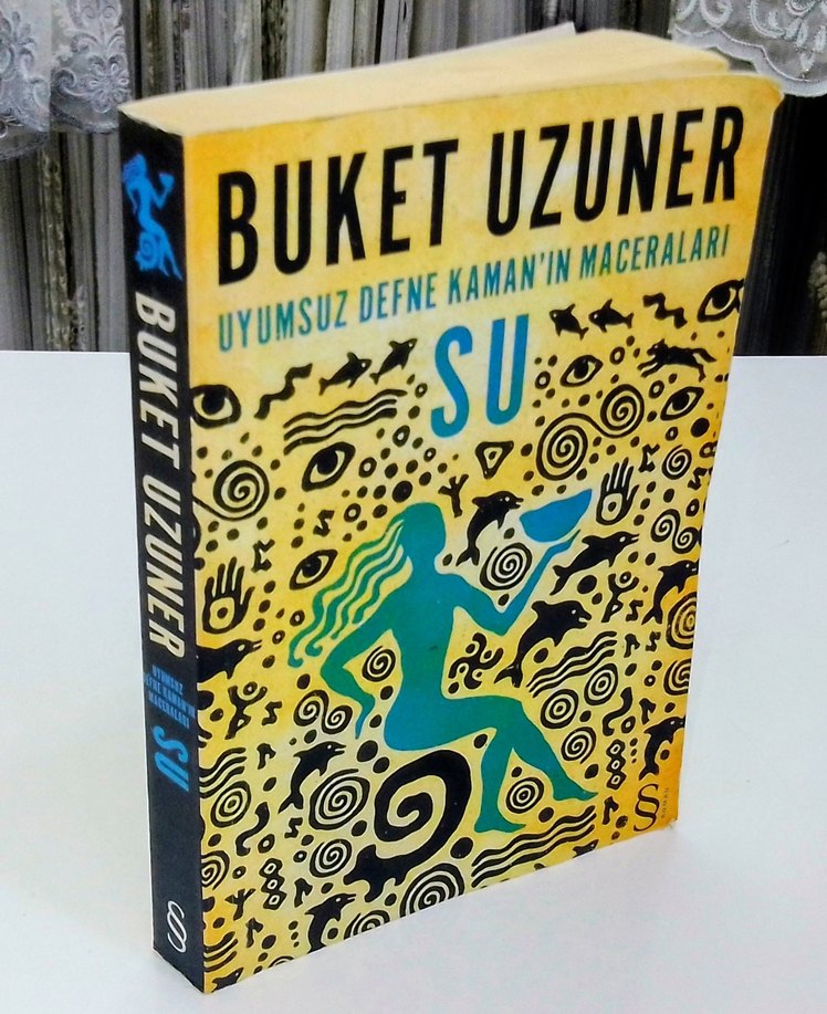 Buket Uzuner'in yazdığı, Defne Kaman'ın maceralarını anlatan "Su" adlı roman. Kapakta soyut desenler ve mavi figür yer alıyor.