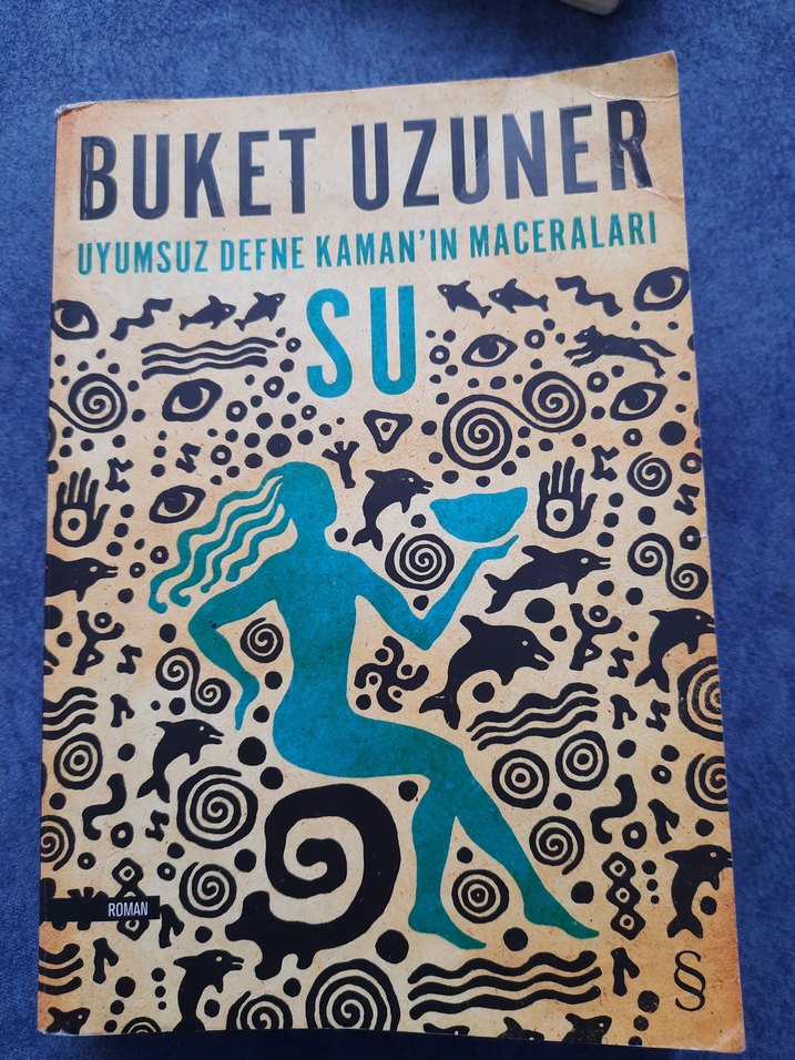 Buket Uzuner'in "Su" adlı romanı, Defne Kaman'ın maceralarını anlatıyor. Kapakta siyah ve turkuaz soyut çizimler bulunuyor.