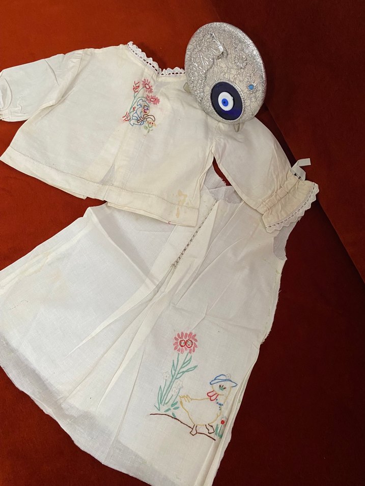 Kadim zamanlardan çok nostaljik sıhhi ,çok organik kumaşlı şirin işlemeli zıbın ve gömlek.zıbının kenar dikişleri çekilmemiş.zıbının kol kenarları fistolu.Sandık lekeleri var.Güzel uykular için.