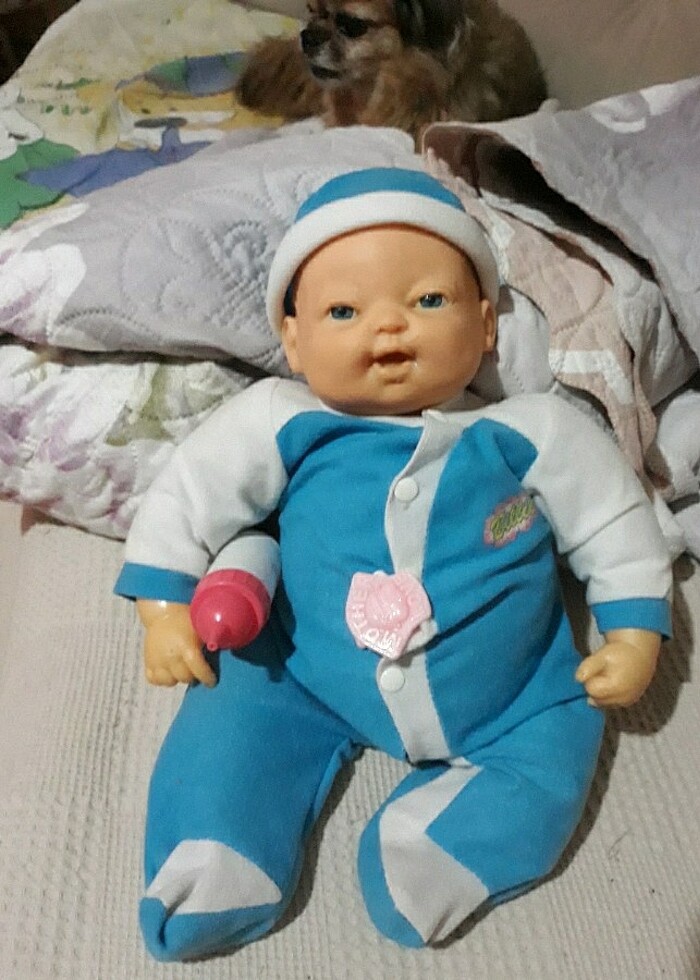 Eline basinca gozleri acilir kapanir,biberonunu emer ağzi hareket eder,yanliz agzinin ici yirtik bana bõyle geldi cocuk oynamadi.pilleri icindedir arkasinda acma kapama dügmesi mevcut.