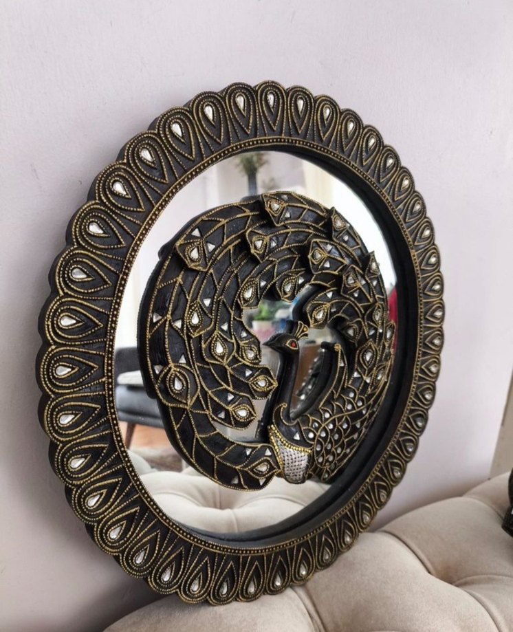 Polimer malzemeden çerçeveli, tavus kuşu desenli yuvarlak aynayi kucuk ayna parçacıkları süslüyor. Mekana şık bir dokunuş katıyor.