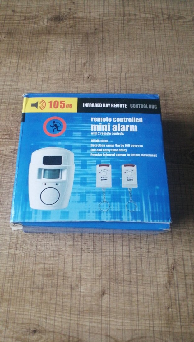 Beyaz mini alarm sistemi, uzaktan kumanda ile çalışır. 105 dB siren, 105 derece algılama ve hareketi pasif kızılötesi sensörle tespit eder. İki uzaktan kumanda içerir.