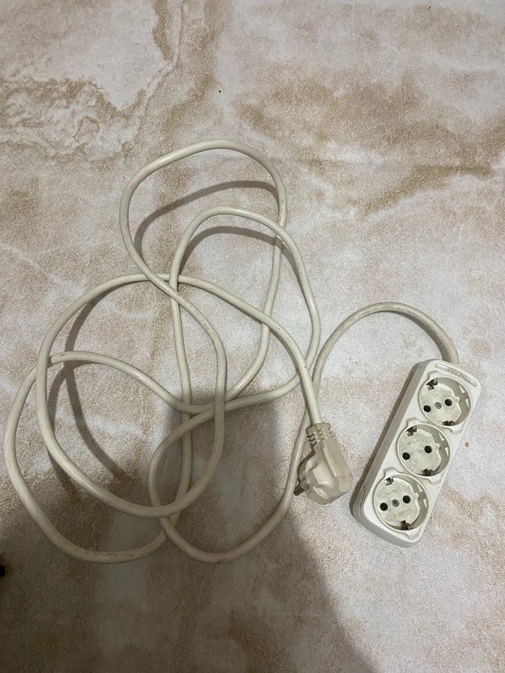 Üçlü priz ve uzun kabloya sahip beyaz uzatma kablosu, pratik güç bağlantısı sağlar. ⚡