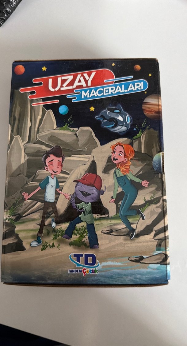 "Uzay Maceraları" kitabı, çocuklar ve bir uzaylı karakterle uzay temalı maceraları anlatıyor. Yayıncı: Tandem Çocuk.