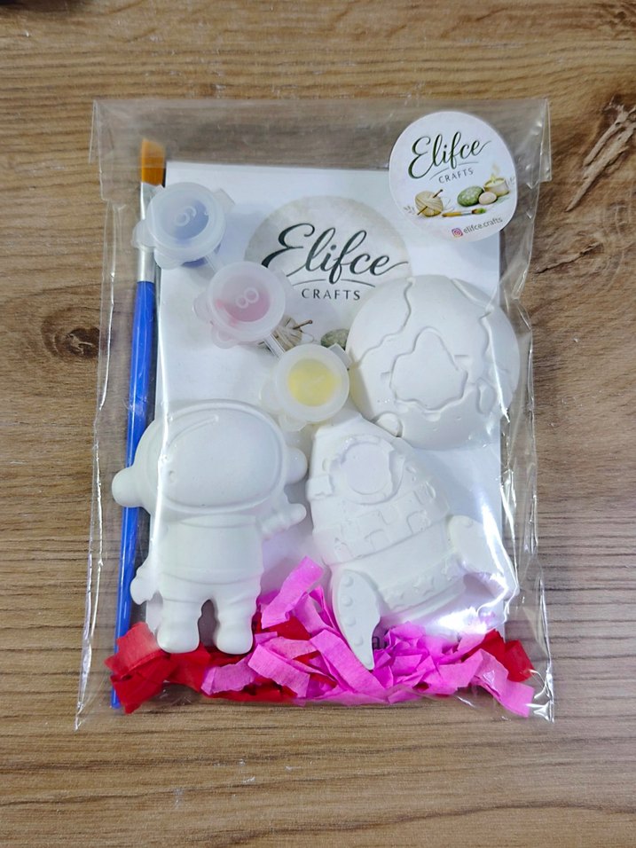 Çocuklar için astronot, roket ve gezegen figürlerinden oluşan beyaz boyama seti. İçinde pastel renklerde boya ve fırça bulunur.