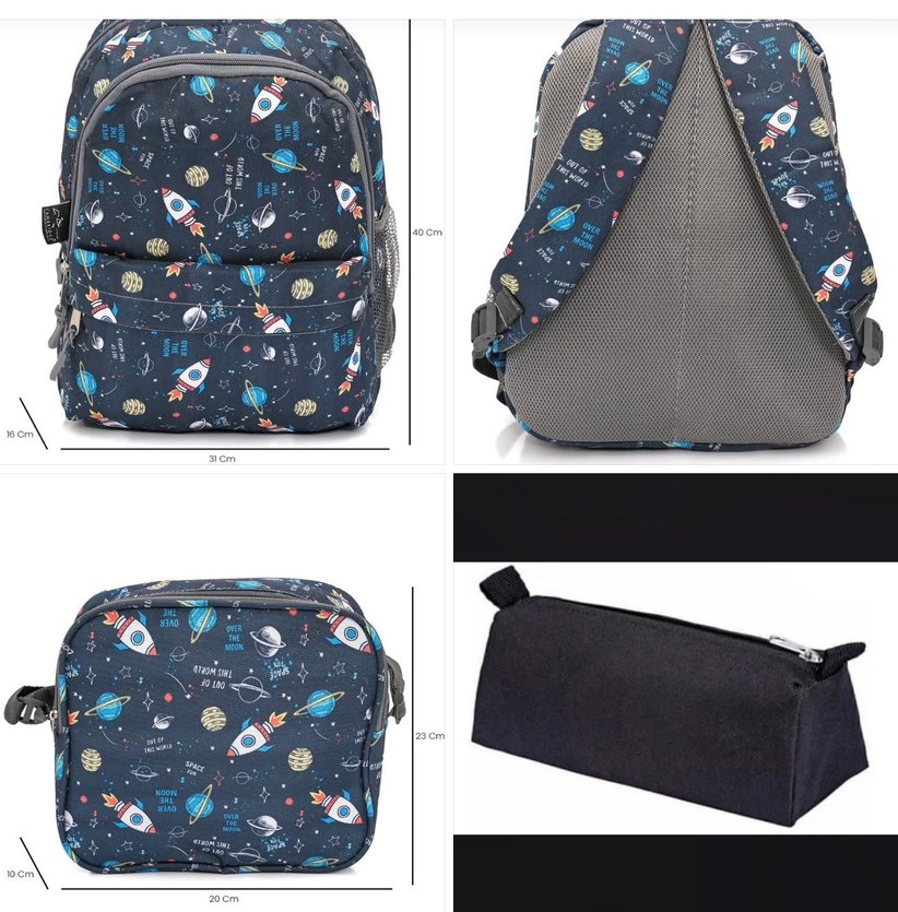 Mavi renkli çocuk okul çantası, uzay temalı roket ve gezegen desenleri içerir. Eşleşen kalemlik ve rahat kullanımı sağlayan yastıklı askılar bulunur. Ölçüler: Çanta 40x31 cm, kalemlik 23x20 cm.