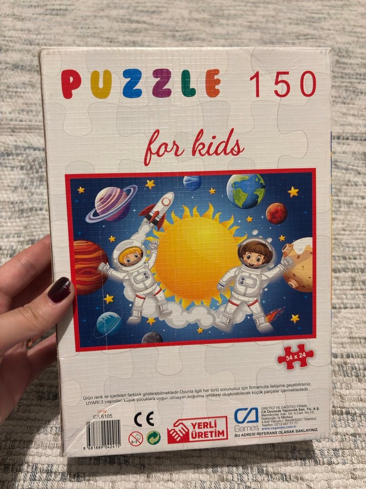 Çocuklar için tasarlanmış, astronotlar ve gezegenler içeren renkli 150 parçalı uzay temalı puzzle.