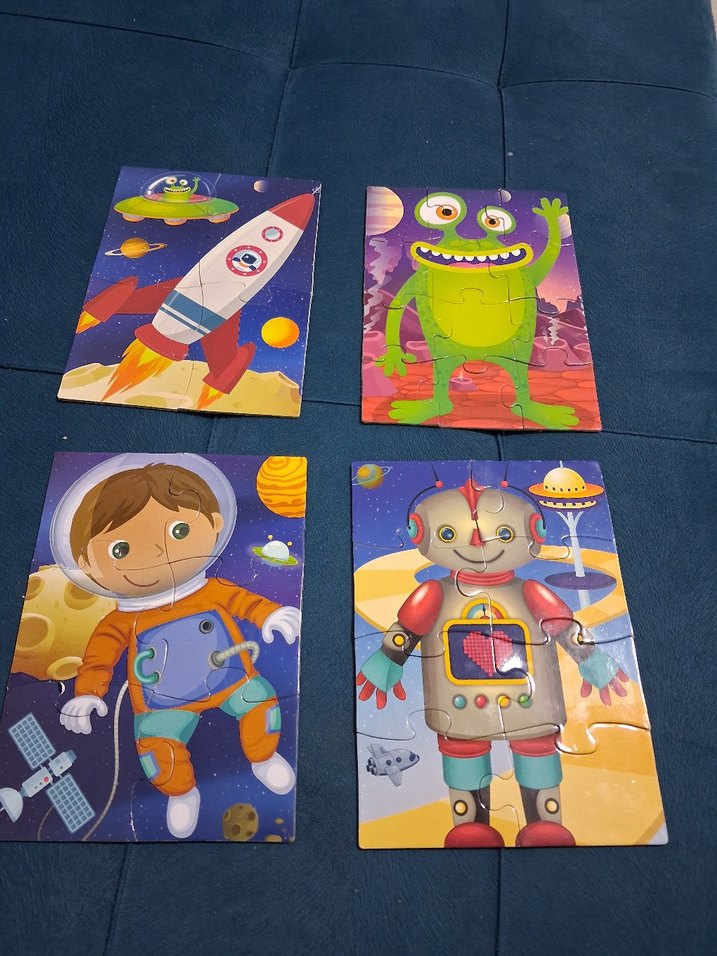 Astronot, robot, uzaylı ve roket temalı, canlı renklerde dört çocuk puzzle seti. Koyu arka planlı, eğlenceli uzay temalı tasarımlar içerir.