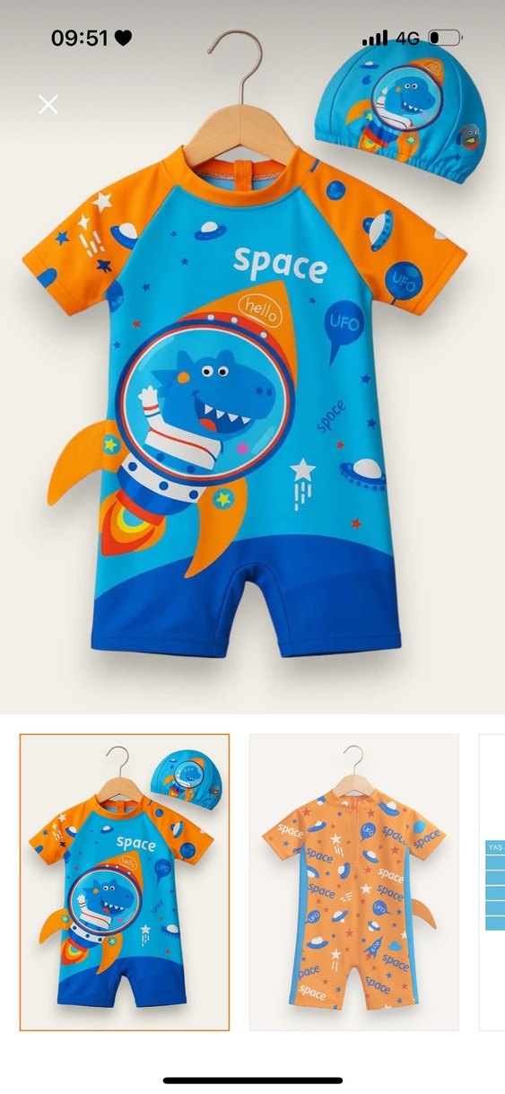 Kısa kollu, renkli uzay temalı baskılı mayo. Dinozor astronot, roket ve UFO desenleri içerir. Aynı desenli şapka dahildir. Ürün bir defa kullanıldı çok temiz 4-5 yaş yazıyor fakat 2 yaş için kullandık