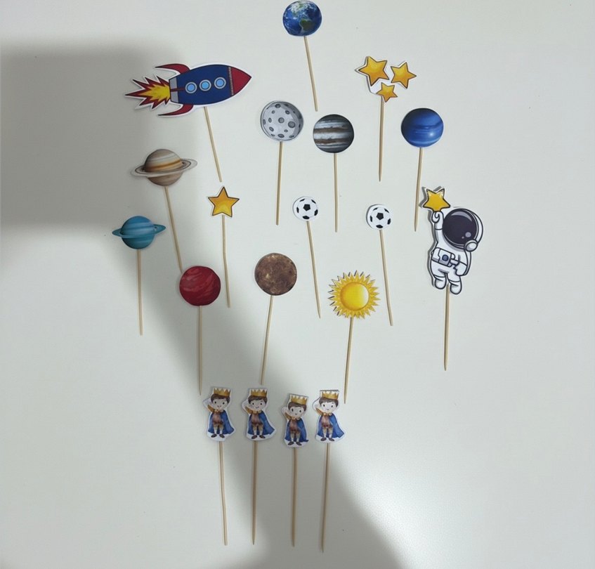 Çubuklu, renkli uzay temalı gezegenler, yıldızlar, roket, astronot ve çizgi film kral figürleri. Dekorasyon veya parti için uygun.