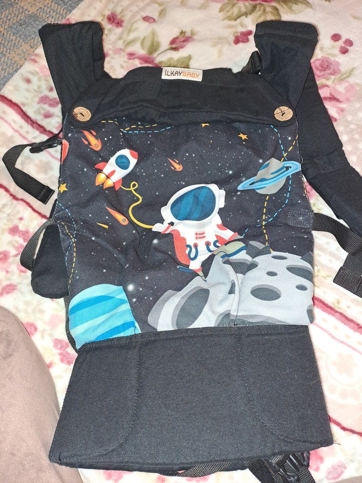 Astronot, gezegenler ve roket desenli siyah bebek taşıyıcı. Rahat askılar ve güvenli bağlama sistemi bulunur.