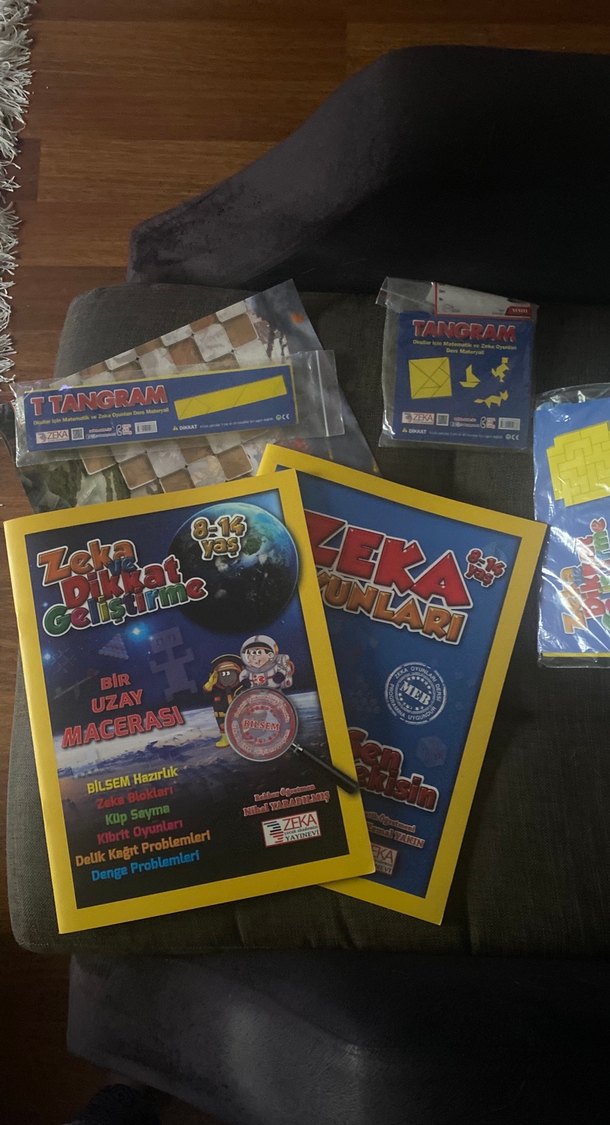 Koyu altın renkli tangram ve uzay temalı zeka oyunları seti. Mekansal ve mantıksal gelişim için tasarlanmış bulmacalar içerir. Kitapların içinde kurşunkalemle yazılı yerler var.