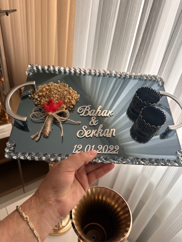 Gri renkli, payetli kenar detaylarına sahip bohem vintage düğün tepsisi. Üzerinde dekoratif kuru çiçekler ve isimler ile tarih yer alır, klasik zarafet sunar.