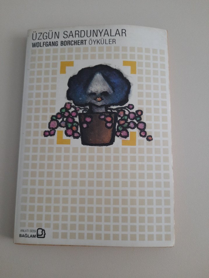 Bağlam yayınevinden Wolfgang Borchert'in 'Üzgün Sardunyalar' adlı öykü kitabı. Kapakta çiçekli saksı resmi yer alıyor.