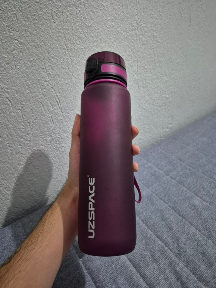 Uzspace marka koyu mor renkte, güvenli kapaklı ve taşıma kayışlı suluk. 1 litre kapasiteli.