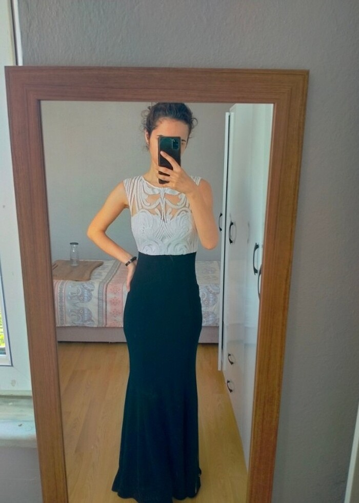 Ürün normalde iki parçaydı biz diktirip elbise yaptırdık. Dilerseniz söktürüp beli açık bir şekilde de kullanabilirsiniz.Deformesi yok. Model boy kilo 164-50 kilo