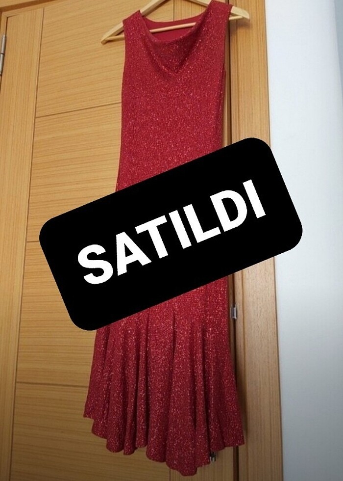 Kırmızı simli uzun eteği dökümlü degaje yaka kadın abiye.Temsili marka