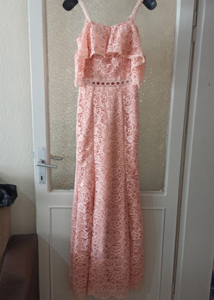 Etek üstü tül askılı Uzun güpürlü Abiye.pudra rengi.Balık modeli.yeni etiketi üstünde kullanılmadı.