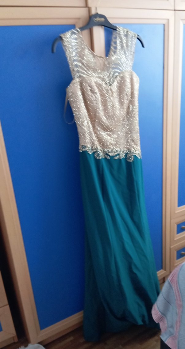 İşlemeli dantel detaylı, straplez yakalı,yeşil uzun abiye elbise sadece arka düğmesi koptu başka hiç bir kusuru yok