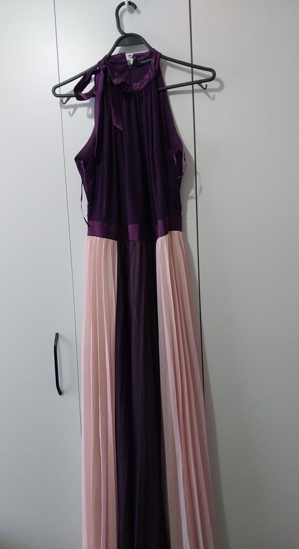 Uzun boy, halter yaka ve piliseli etek detaylarına sahip mor abiye elbise. Kolsuz ve desensiz. 1 kez giyildi. arka kısmında küçük bir söküğü var.