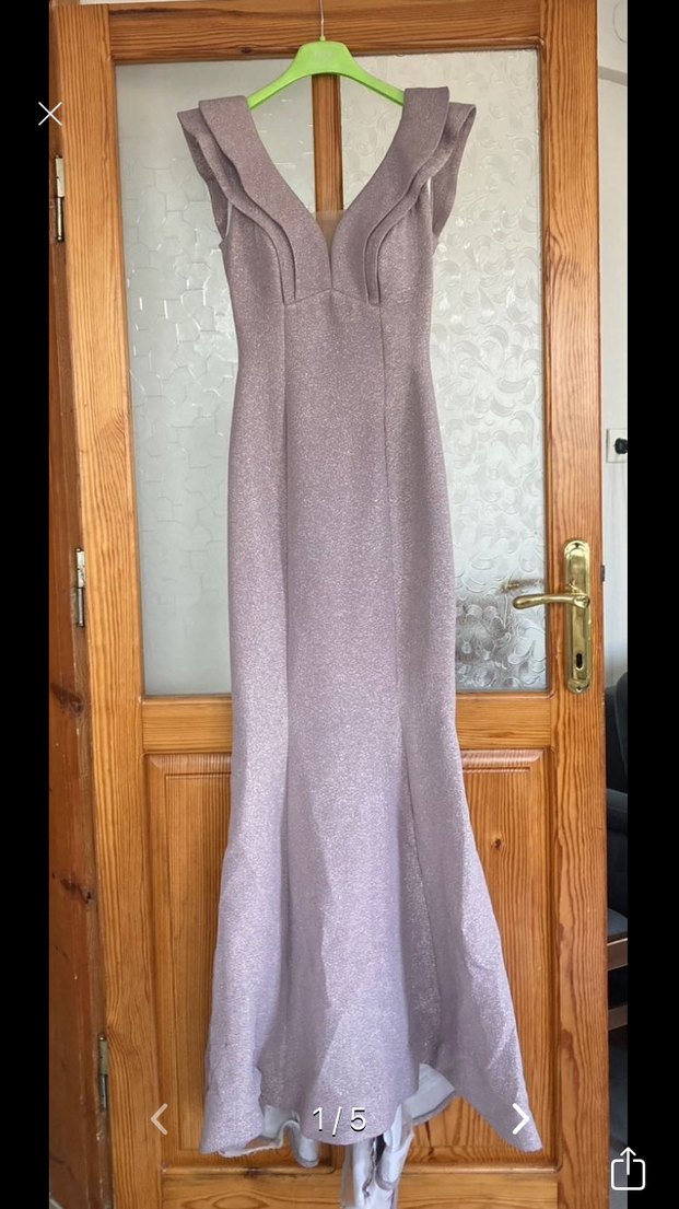 V yaka ve kolsuz, drapeli tasarıma sahip uzun, vücuda oturan abiye elbise. Gri-bej renk ve çağdaş stil, düğün için uygun.