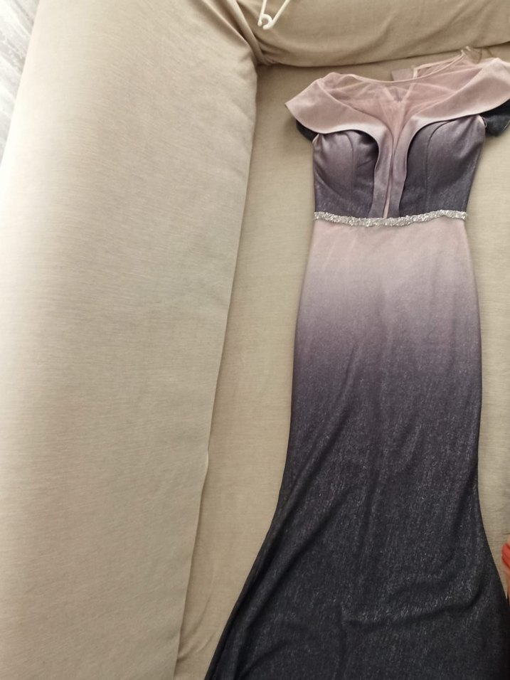 Kolsuz, tekne yaka ve drapeli detaylar içeren bu uzun abiye elbise, gri tonlarında tie-dye deseniyle modern ve şık bir görünüm sunar. ✨