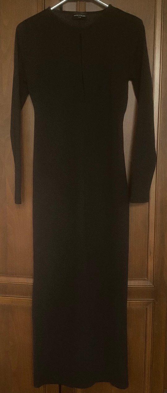 Boyu 135 cm iki koltuk arası 36 cm iki omuz arası 40 cm Uzun kollu, v yaka, vücuda oturan bu siyah elbise, sentetik kumaştan ve drapeli tasarıma sahip. Gotik ve avangart tarzda, ofis için uygun. İade kabul etmiyorum