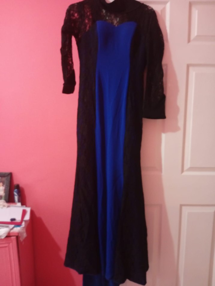 Uzun kollu siyah dantel detaylı, mavi drapeli straplez uzun abiye elbise, klasik gotik tarzda parti için uygundur.