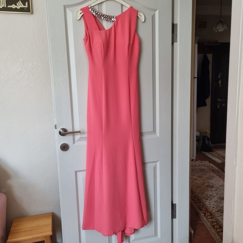 Uzun ve kolsuz bu abiye elbise, yakasındaki taş detayı,hafif uzun kuyruğuyla ve minimalist tasarımıyla düğünler için şık ve modern bir seçenek. Sadece 1 kez giyilmiştir.