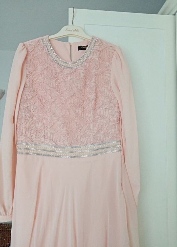 Uzun Yakası ve beli taş detaylı tesettür abiye elbise ön tarafında ufak bir defosu var